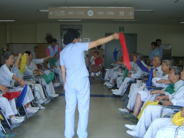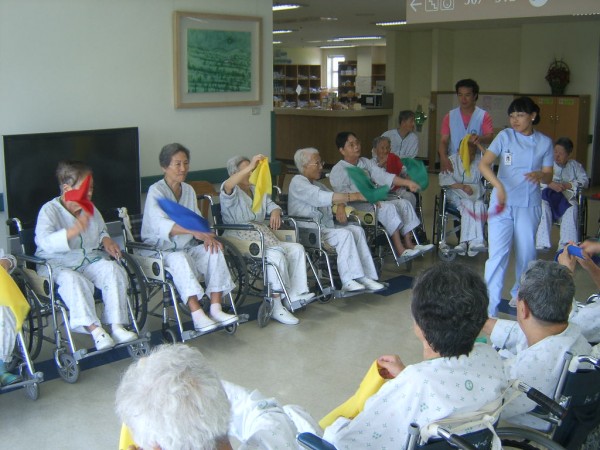빨강, 노랑, 파랑 형형색색의 스카프를 위, 아래로 흔들어 어르신들이 무척 신나하며 좋아 하셨습니다.