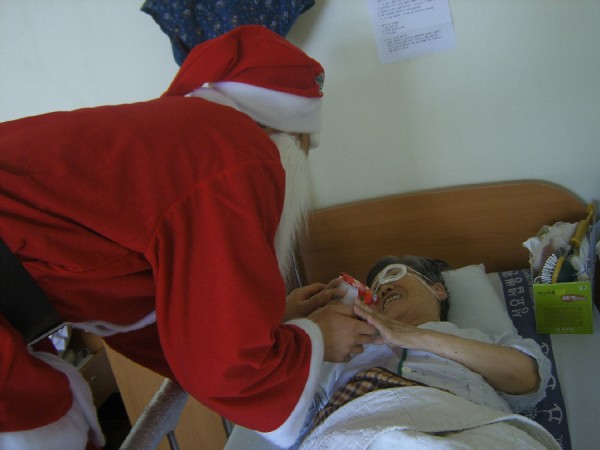 산타에게 따뜻한 수면 양말을 선물 받고 함께 사진을 찍으며 행복한 시간을 보내셨습니다.