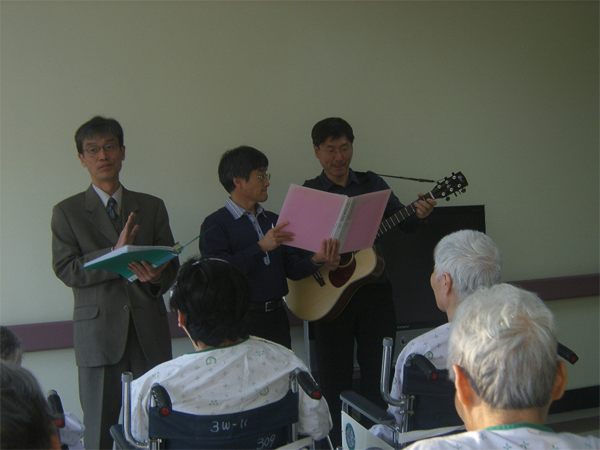 입원해 계신 기독교 신자 분들을 위해 백성교회 목사님과 신자 분들이 오셔서 예배와 찬양을 해 주셨습니다..