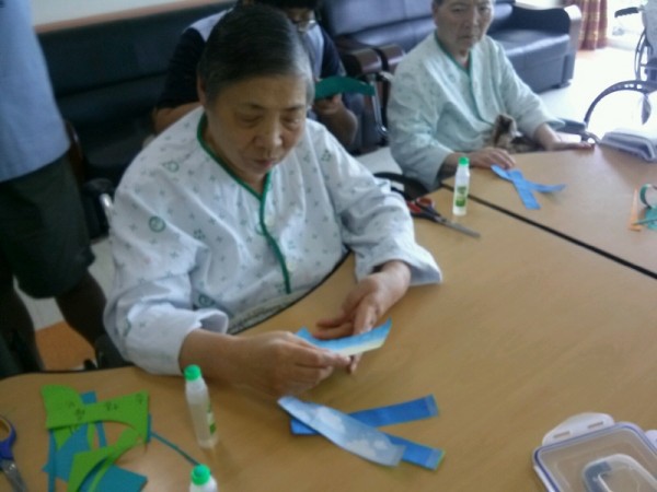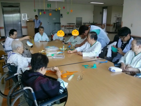 가위로 오리는 건 학생들이~ 풀로 붙이는 건 우리 어르신들이~