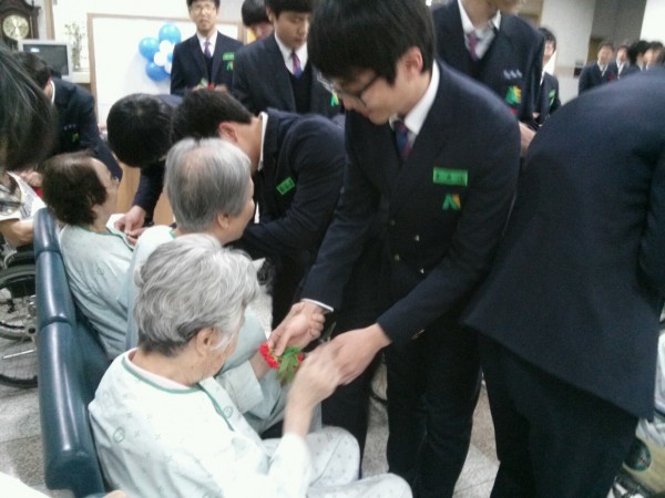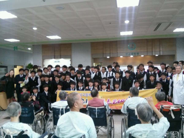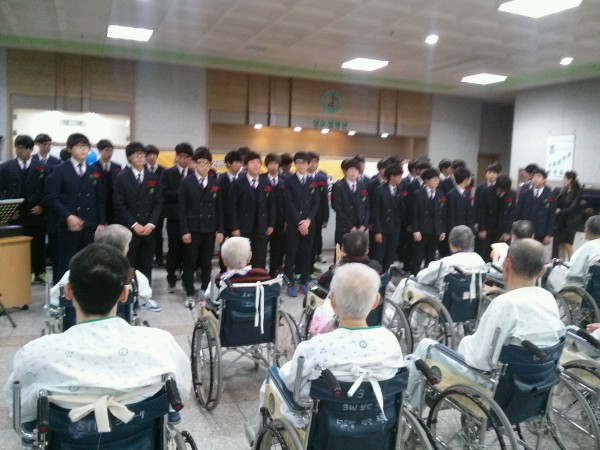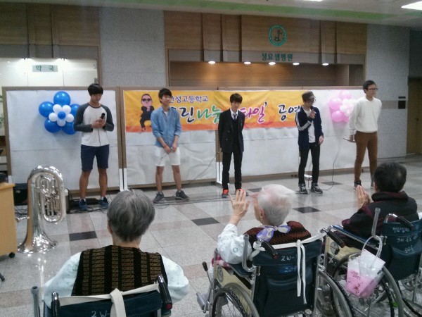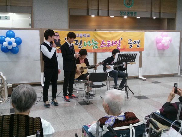 내일모레면 어버이날입니다.^^ 이번에 어버이날을 맞이하여 안성고등학교 재능나눔봉사동아리 '우린 나눔 스타일' 팀의 위문공연이 있었습니다. 기타연주, 가요, 댄스, 튜바독주, 합창 등의 다양한 공연을 선보였습니다. 손자, 손녀 같은 학생들의 공연에 어르신들이 무척 흡족해 하시며 즐거운 시간을 보내셨고, 마지막에 학생들이 어버이은혜를 부르며 어르신들에게 카네이션을 달아드렸는데 어르신들의 눈시울이 붉어졌던 감동의 시간이었습니다.