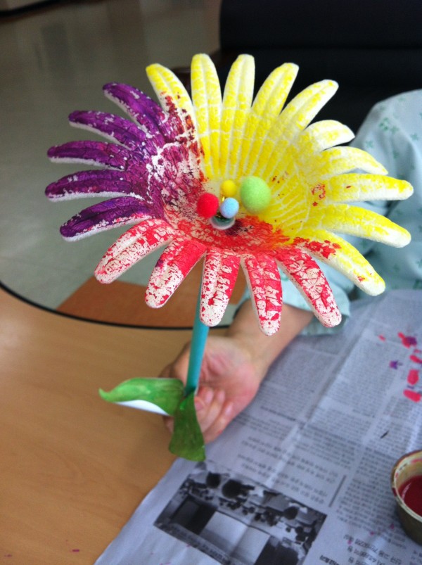 물감으로 알록달록 색을 입히니 과일싸개가 예쁜 꽃으로 변했습니다.