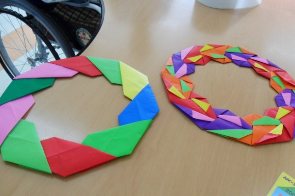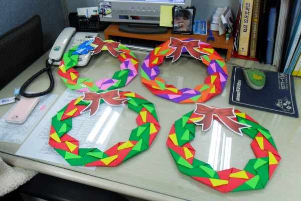 하나씩을 접어 여러개를 연결하여 만들어 멋진 리스가 완성되었습니다.