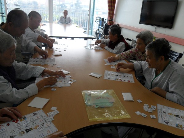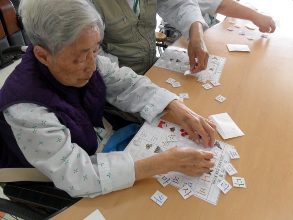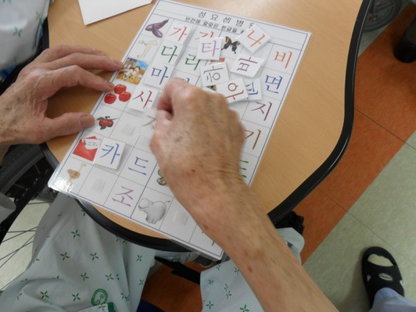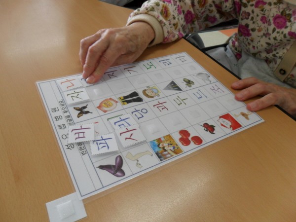 어르신들과 그림카드를 보며 단어카드를 이야기 나눈 뒤, 비어있는 카드 단어의 란에 짝을 맞추어 보는 인지요법 시간입니다.